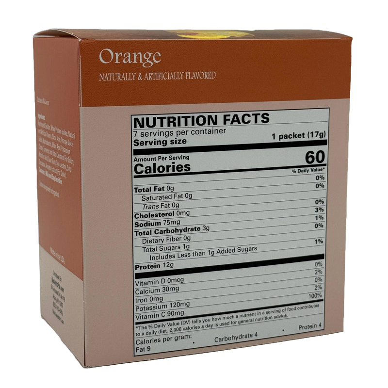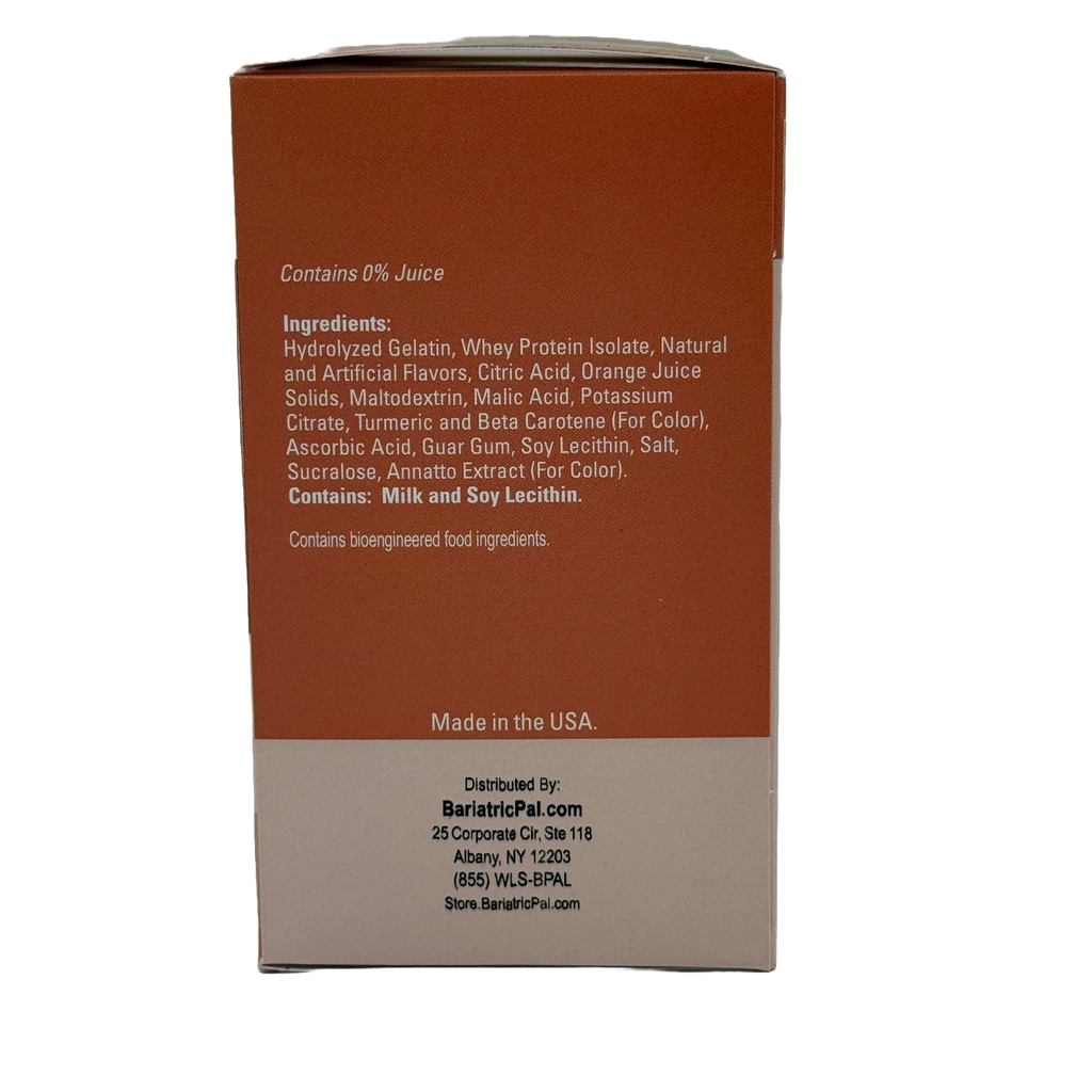 Hydrolyzed Gelatin, Whey Protein Isolate, Natural and Artificial Flavors, Citric Acid, Orange Juice Solids, Maltodextrin, Malic Acid, Potassium Citrate, Turmeric and Beta Carotene (For Color), Ascorbic Acid, Guar Gum, Soy Lecithin, Salt, Sucralose, Annatto Extract (For Color).