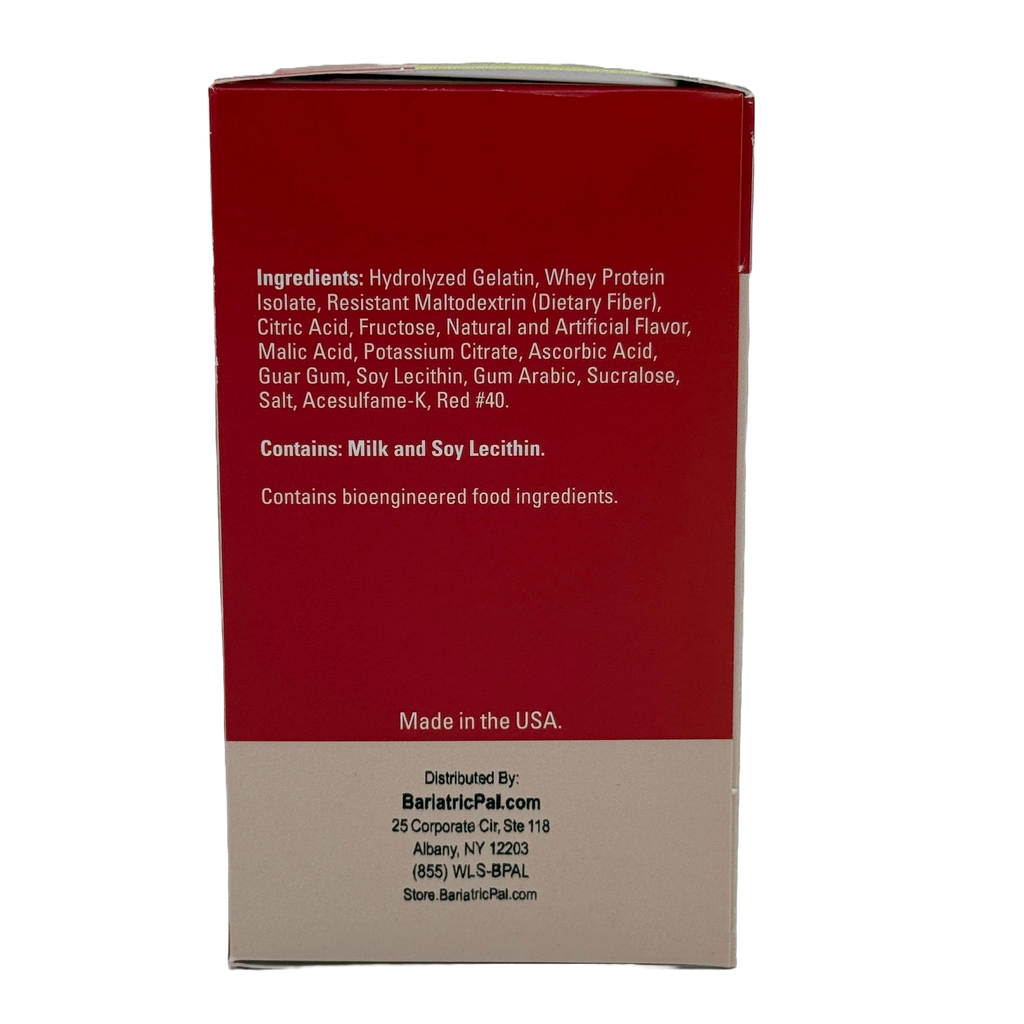 Hydrolyzed Gelatin, Whey Protein Isolate, Resistant Maltodextrin (Dietary Fiber), Citric Acid, Fructose, Natural and Artificial Flavor, Malic Acid, Potassium Citrate, Ascorbic Acid, Guar Gum, Soy Lecithin, Gum Arabic, Sucralose, Salt, Acesulfame-K, Red #40.