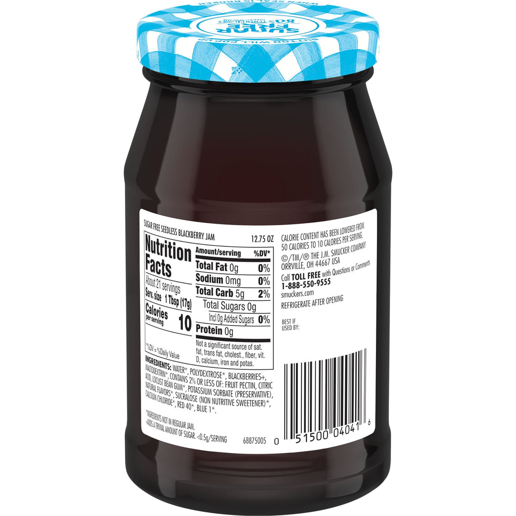 Smuckers Sugar Free Jam has 80% fewer calories than regular jam and delivers the refreshing taste of sweet low carb jam without all of the sugar.