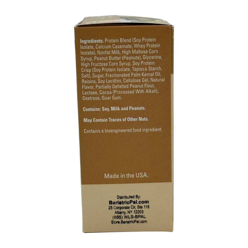 Ingredients: Protein Blend (Soy Protein Isolate, Calcium Caseinate, Whey Protein Isolate), Nonfat Milk, High Maltose Corn Syrup, Peanut Butter (Peanuts), Glycerine, High Fructose Corn Syrup, Soy Protein Crisp (Soy Protein Isolate, Tapioca Starch, Salt), Sugar, Fractionated Palm Kernel Oil, Raisins, Soy Lecithin, Cellulose Gel, Natural Flavor, Partially Defatted Peanut Flour, Lactose, Cocoa (Processed With Alkali), Dextrose, Guar Gum.