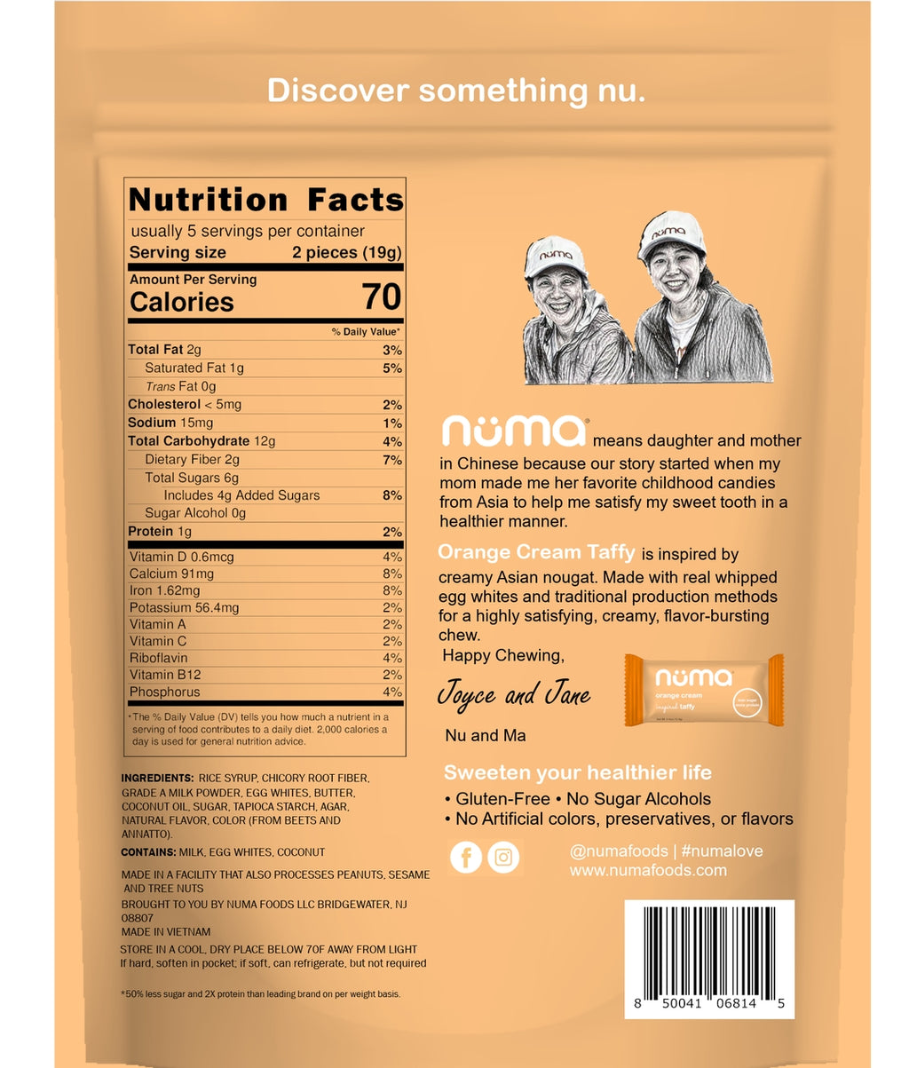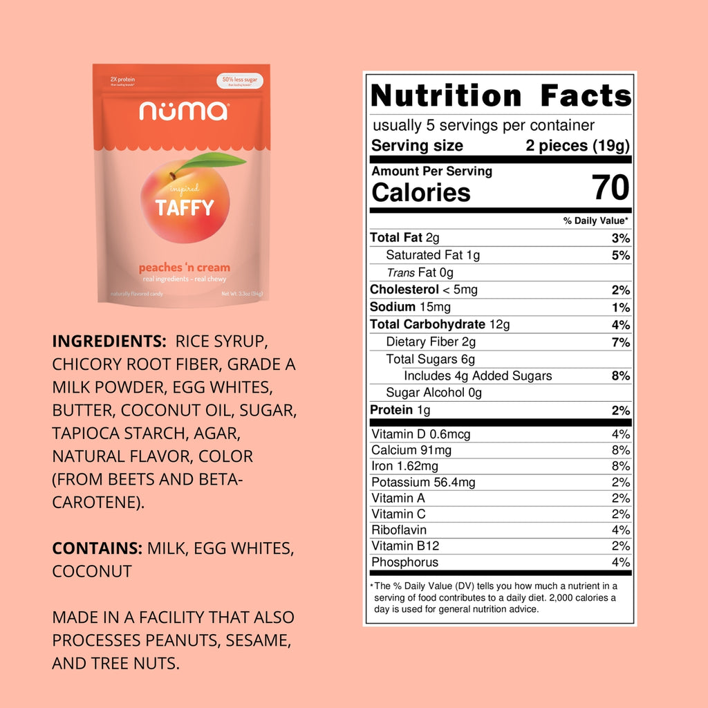 Inspired by traditional Asian creamy nougat, Numa taffies deliver a satisfyingly chewy, melt-in-your-mouth texture with real milk or coconut powder, egg whites, and natural extracts. Alongside protein from egg whites or milk, many versions also include a boost of essential vitamins