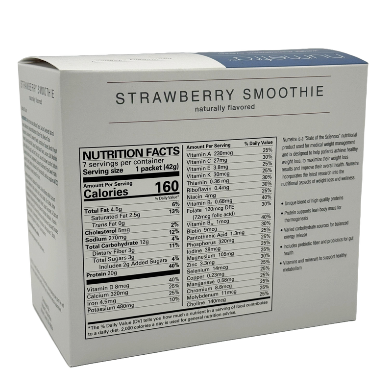 The Numetra Protein Smoothie is a creamy, refreshing beverage designed to support your health and nutrition goals—whether you're managing weight, recovering post-bariatric surgery, or following a therapeutic or high-protein diet. Each serving delivers 20 grams of premium protein to help maintain lean muscle mass, support healing, and keep you feeling satisfied.