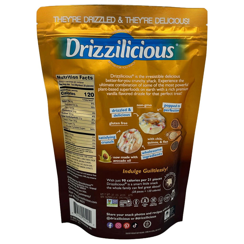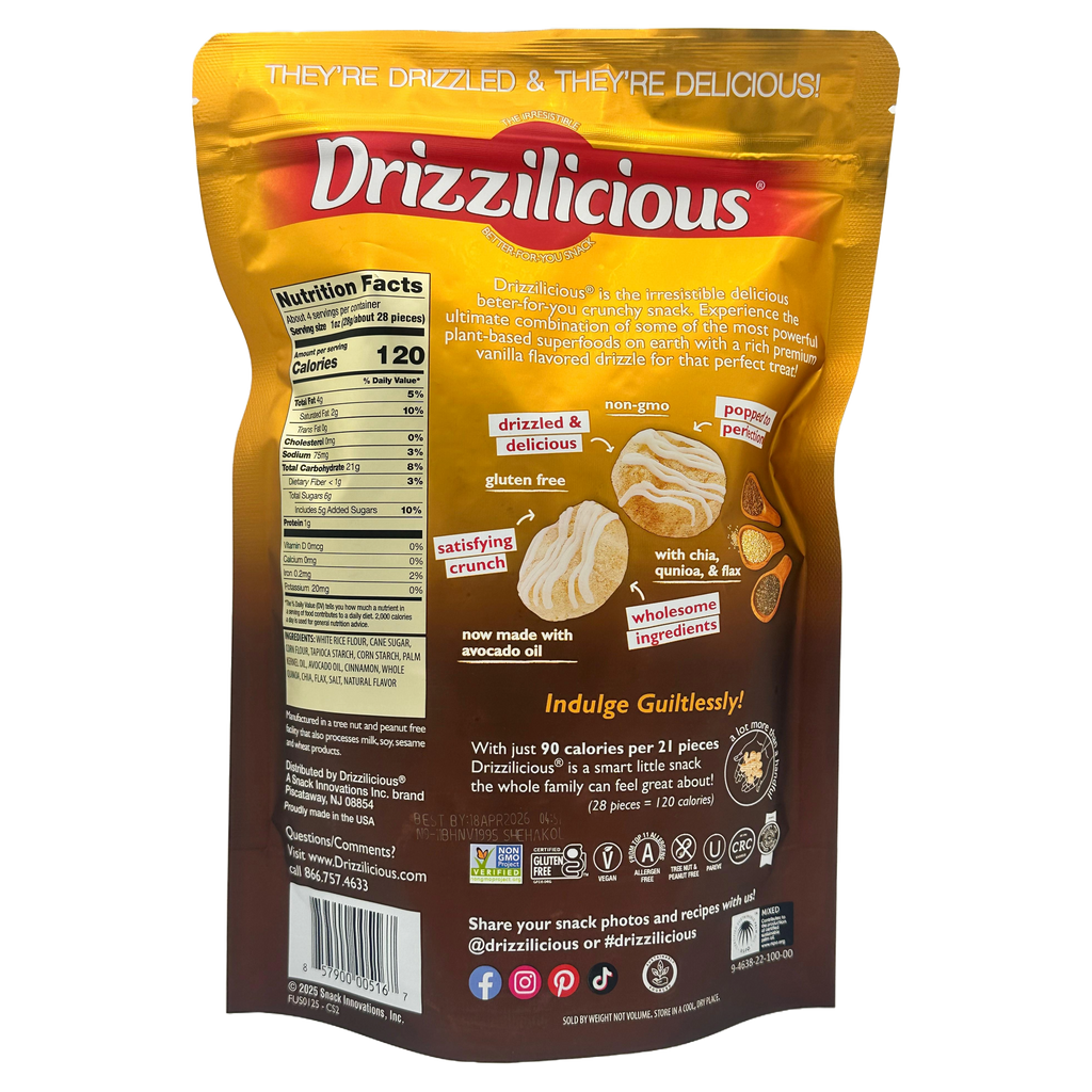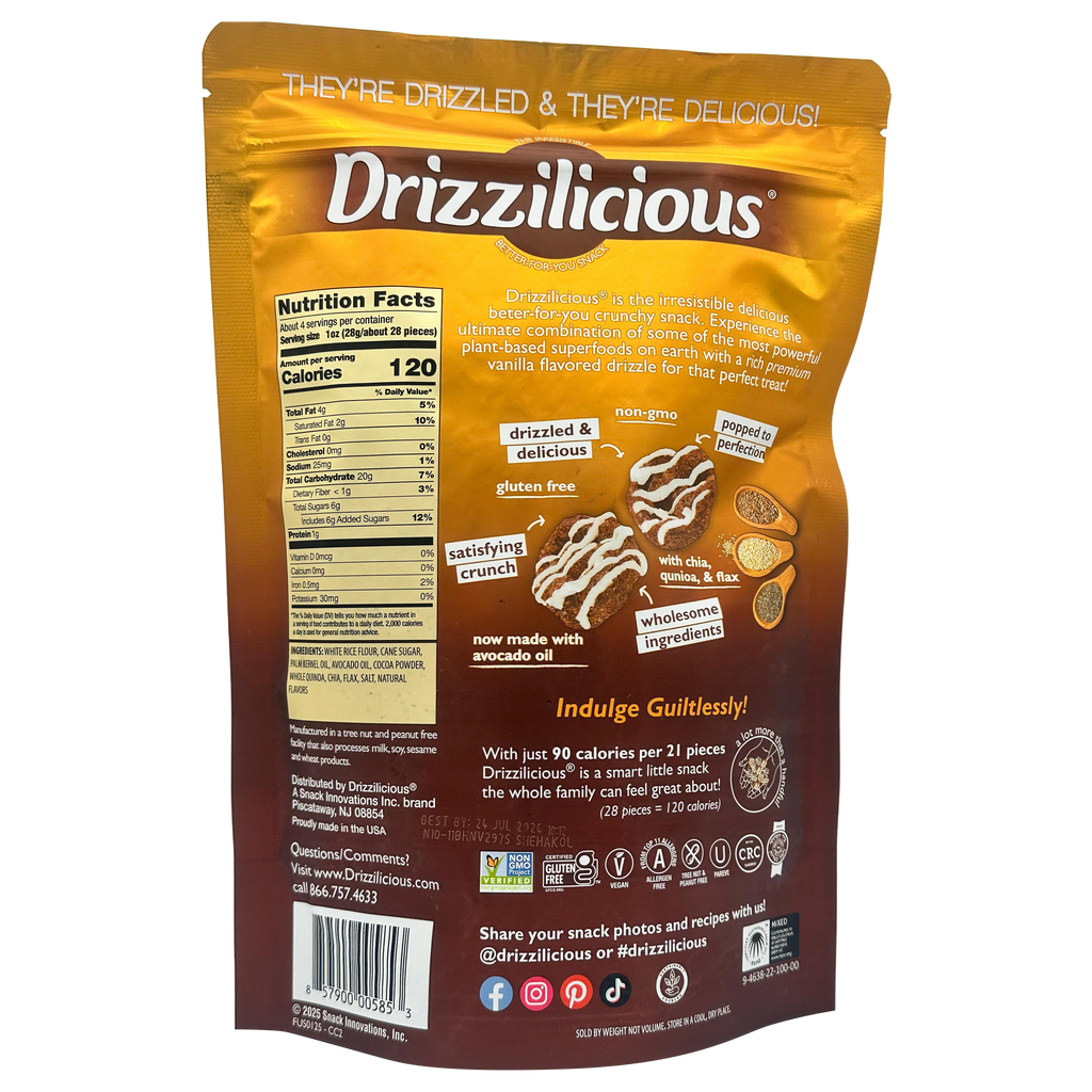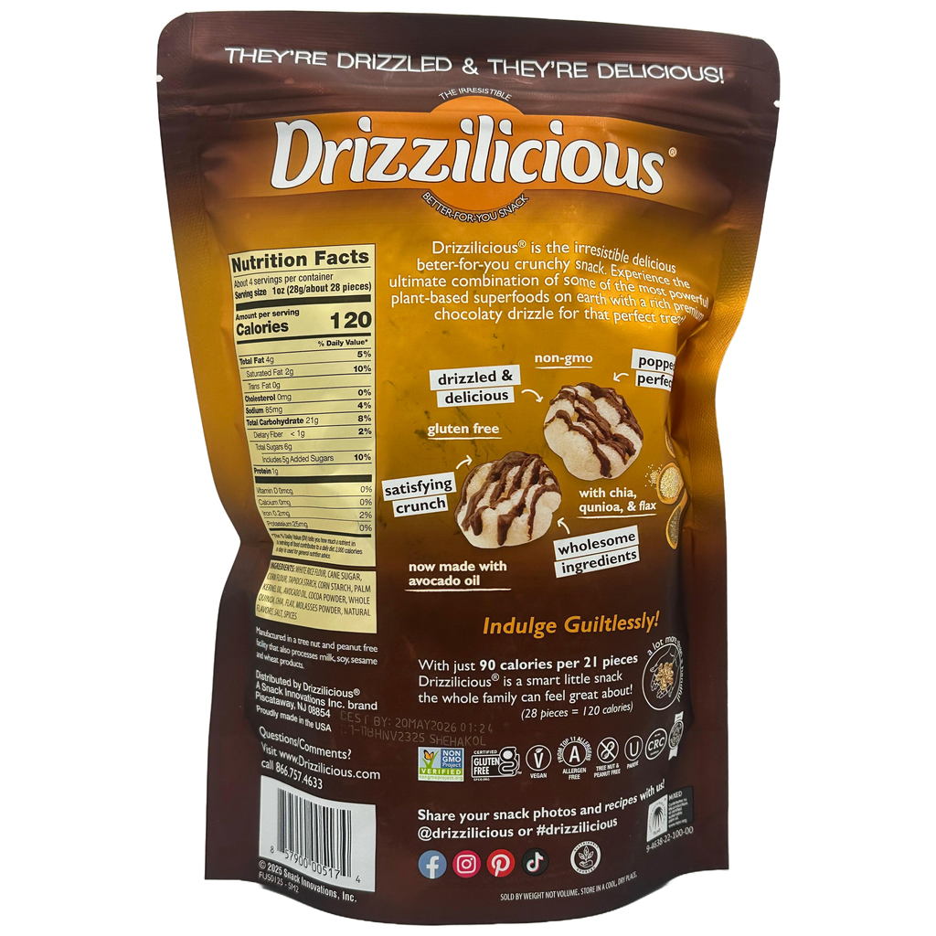 Made with quinoa, chia, and flax, it's the ultimate combination of some of the most powerful plant-based superfoods on earth, mixed with a delicious & premium chocolaty drizzle. Drizzilicious is a smart little snack the whole family can feel great about!