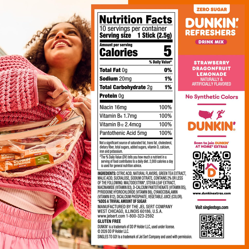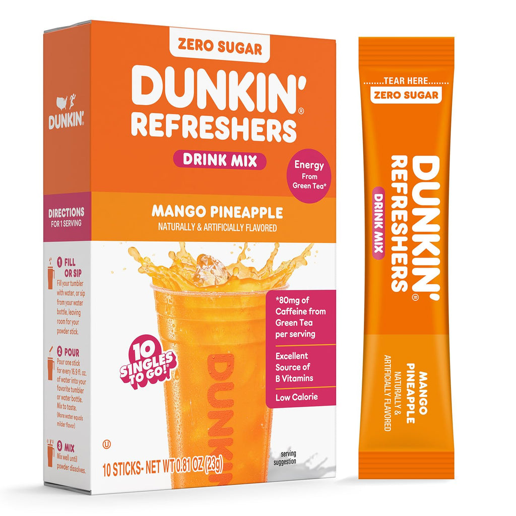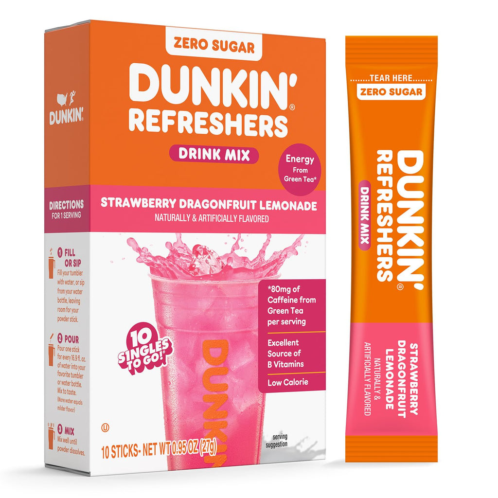 Same Dunkin’ taste you love now in a drink mix that moves with you. Dunkin’ Refreshers Drink Mix is fueled with energy from green tea and B vitamins to help you power through the day no matter how you run. Zero sugar, Sweetened with stevia and sucralose, low in calorie and gluten free in every sip. Try a whole new way to take Dunkin’ Refreshers with you for flavor and function that turns everyday water into something fun, refreshing and distinctly Dunkin’.