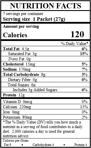 Calcium Caseinate, Cream Cheese (Pasteurized Milk and Cream, Cheese Cultures, Salt, Carob Bean Gum), Nonfat Milk, Fructose, Sugar, Modified Cornstarch, Natural and Artificial Flavors (Includes Soy Lecithin and Egg), Konjac (Thickener), Maltodextrin, Sodium Phosphate, Cheddar Cheese (Cultured Milk, Salt, Enzymes), Whey, Lactic Acid, Buttermilk, Milk Protein Isolate, Beta-Carotene (For Color), Salt, Corn Syrup Solids, Sunflower Lecithin, Disodium Phosphate, Sucralose, Tricalcium Phosphate, Monoglycerides.