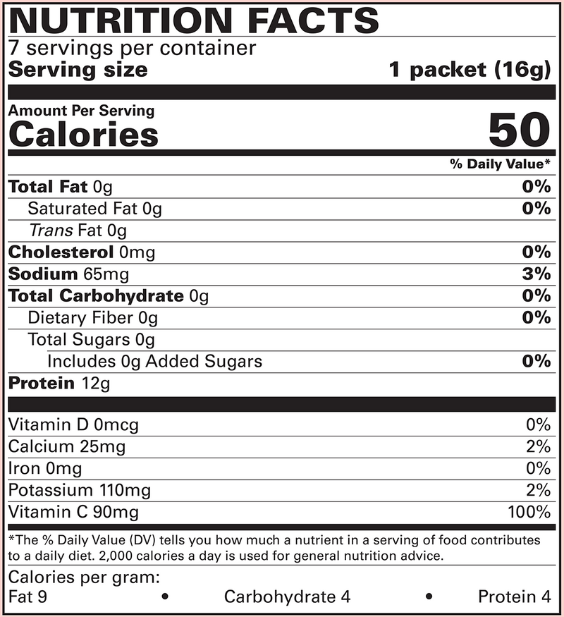 Hydrolyzed Gelatin, Whey Protein Isolate, Citric Acid, Maltodextrin, Natural and Artificial Flavor, Malic Acid, Potassium Citrate, Ascorbic Acid, Guar Gum, Aspartame*, Soy Lecithin, Gum Arabic, Salt, Red #40.