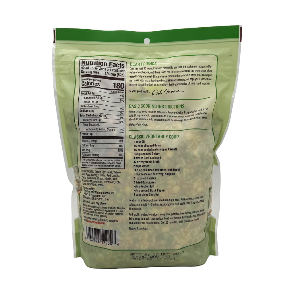 Bob's Red Mill Vegi Soup Mix is a high fiber, vegan soup mix that contains green split peas, yellow split peas, barley, lentils and pasta. Bob's Red Mill Vegi Soup Mix has no seasonings so you can add your own spices and salt to suit your tastes.