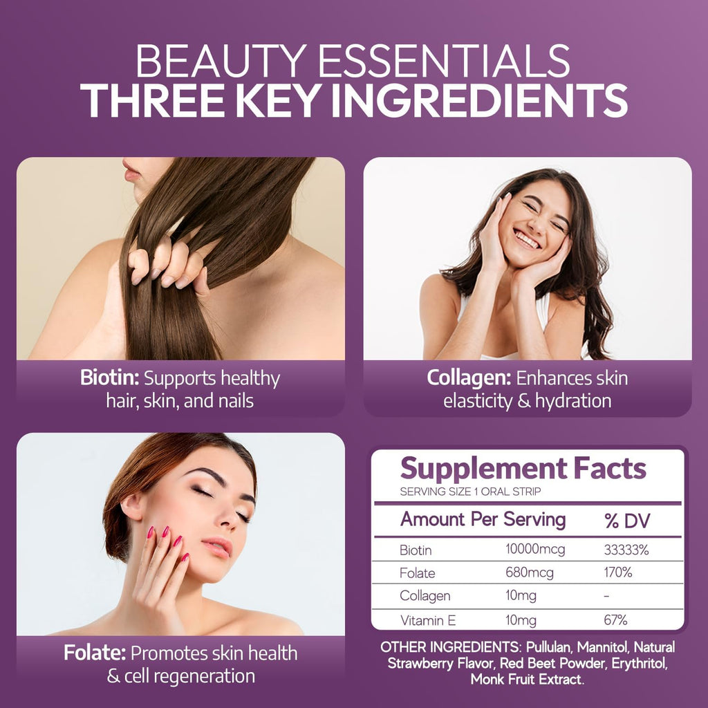 - Fast-Dissolving & Effective: Designed for maximum nutrient absorption, these strips work quickly to support beauty from within.