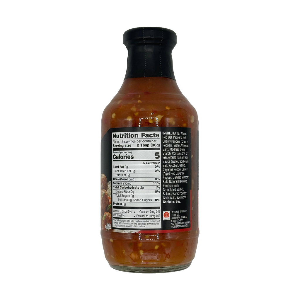 - Sweet Chili - Water, Red Bell Peppers, Hot Cherry Peppers (Cherry Peppers, Water, Vinegar, Salt), Modified Corn Starch, Salt, Tamari Sauce (Water, Soybeans, Salt), Garlic, Cayenne Pepper Sauce (Aged Red Cayenne Pepper, Distilled Vinegar, Salt, Natural Flavoring, Xanthan Gum, Granulated Garlic), Spices, Garlic Powder, Citric Acid, Sucralose. CONTAINS: SOY
