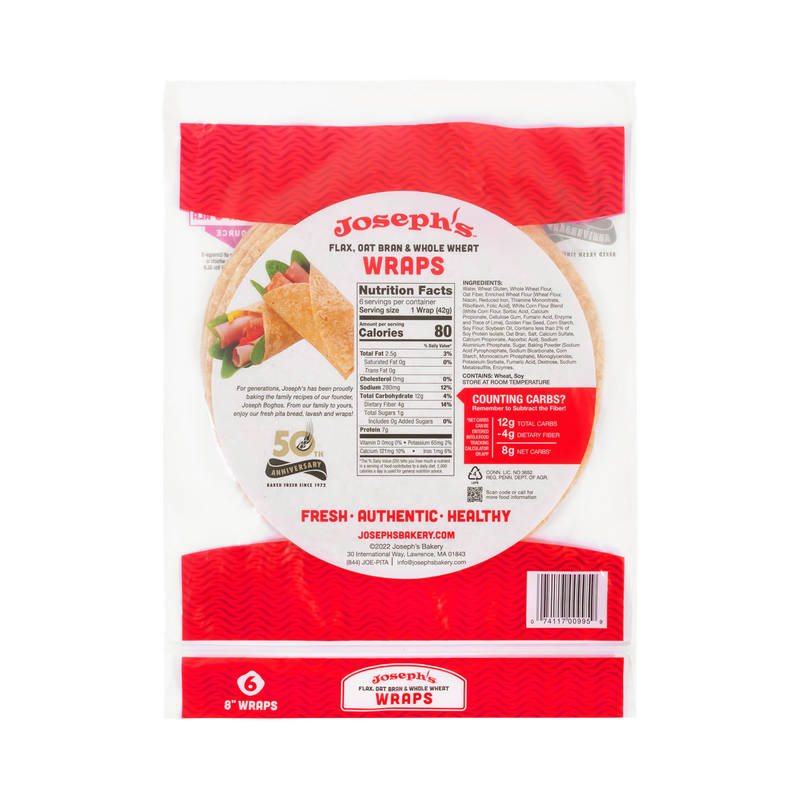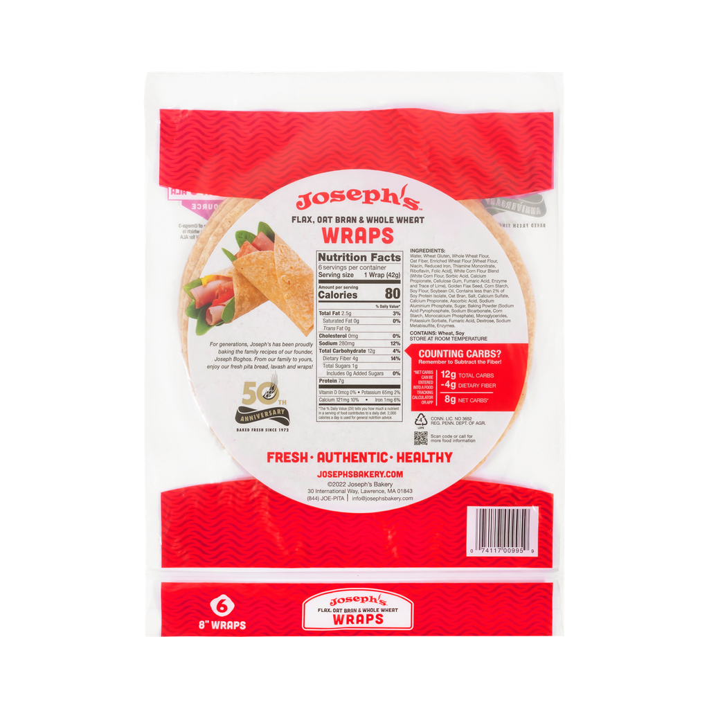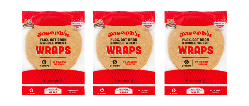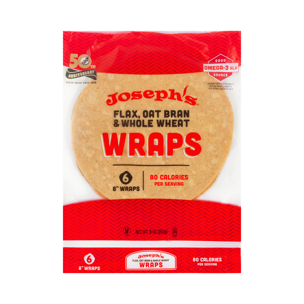 Joseph's Bakery Flax, Oat Bran & Whole Wheat Wraps have lower carbs than traditional wraps, and are a good source of protein and Omega-3 ALA. These low carb wraps are a great alternative for sandwiches, quesadillas, and tacos.