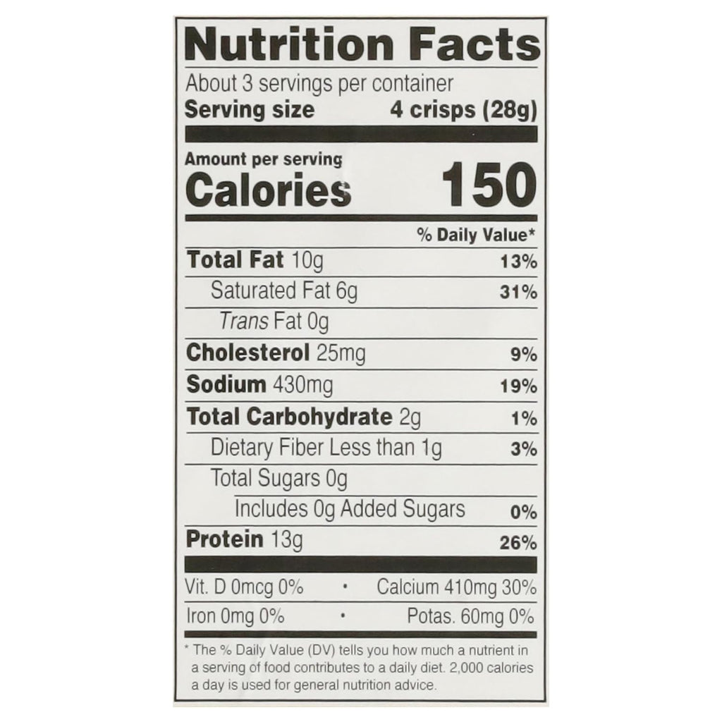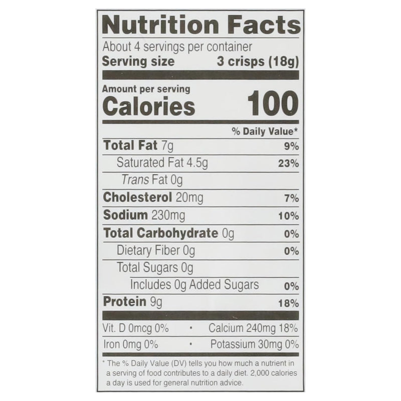 Parm Crisps are artisan-crafted, crunchy crisps made of 100% Aged Parmesan Cheese (sourced from the U.S.A.) and premium seasonings. Oven-baked in small batches, ParmCrisps are naturally gluten-free and sugar-free with no artificial flavors, colors, or preservatives. Pair these parmesan crisps with your favorite beverage, and enjoy on a salad, soup, or straight out of the bag. Parm Crisps can also be used as a chip for dipping.