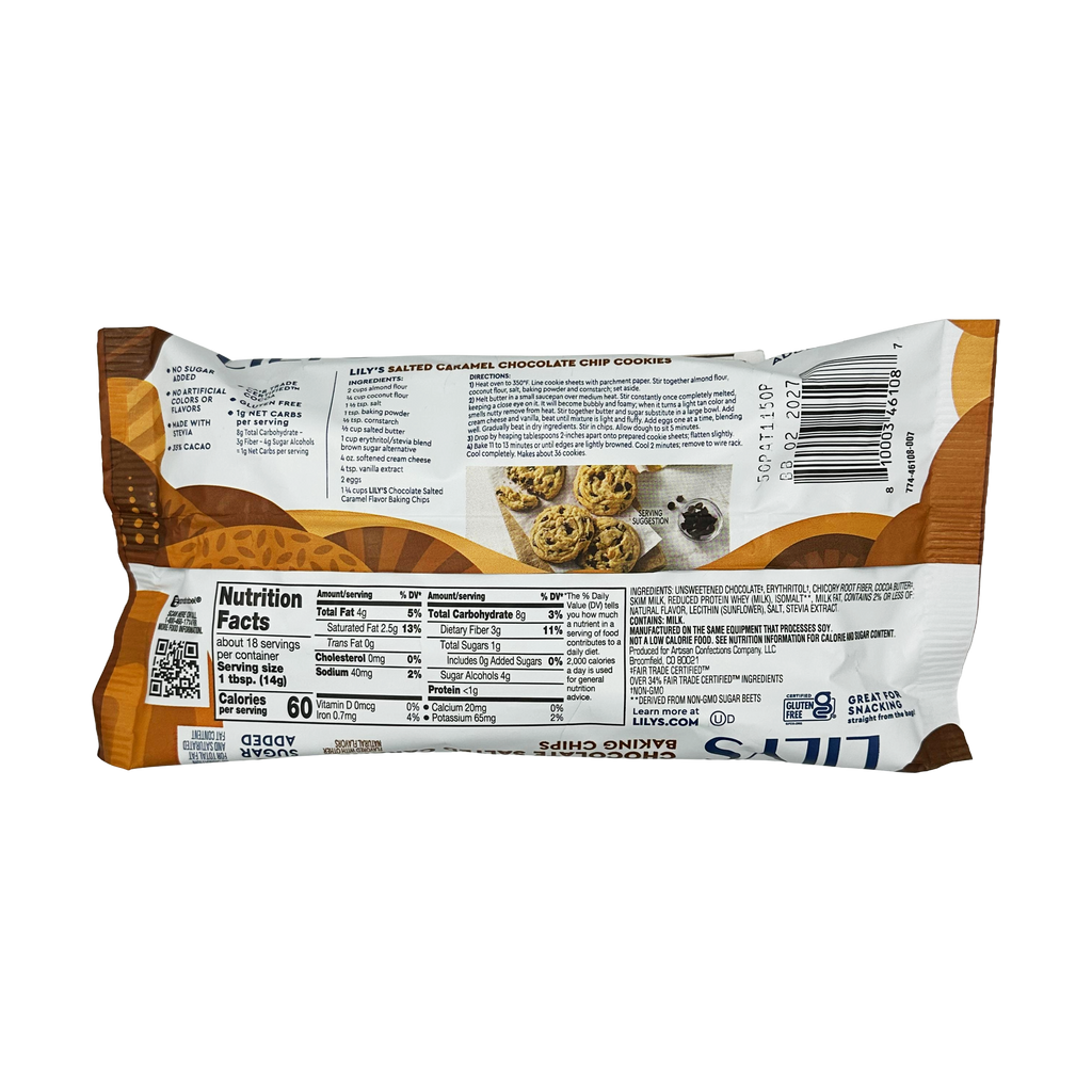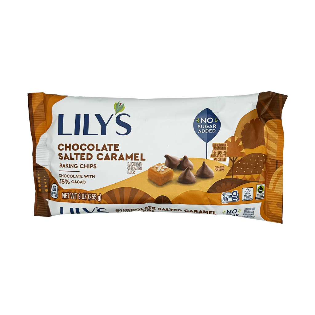 Lily's Sweets Chocolate Salted Caramel Flavor Baking Chips are low carb chocolate chips that fit nicely into your low carb lifestyle. Sweetened with erythritol and stevia, Lily's Sweets Chocolate Salted Caramel Flavor Baking Chips contain no added sugar.
