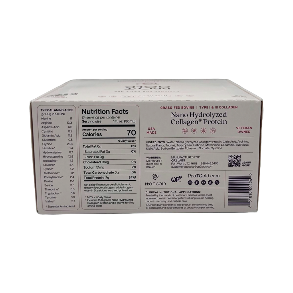 ProT Gold is a COMPLETE Protein unlike most hydrolyzed collagen proteins on the market. It is fortified with Arginine, Taurine, Tryptophan, Histidine, Methionine, Glutamine, and Cysteine.