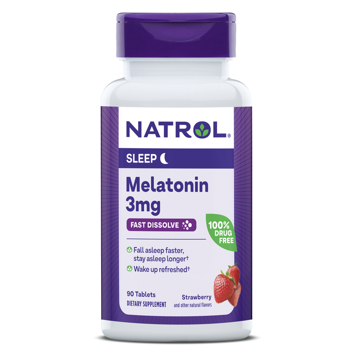 Natrol Melatonin Fast Dissolve is a nighttime sleep aid that assists with occasional sleeplessness, while also working to help reduce overall anxiety. Natrol Melatonin Fast Dissolve helps to establish normal sleep patterns to give you a more restful, relaxing sleep and in turn, better overall health by promoting a healthy immune system.* Natrol's unique fast dissolve strawberry formula enables faster absorption that can be taken anytime, anywhere. No water needed.