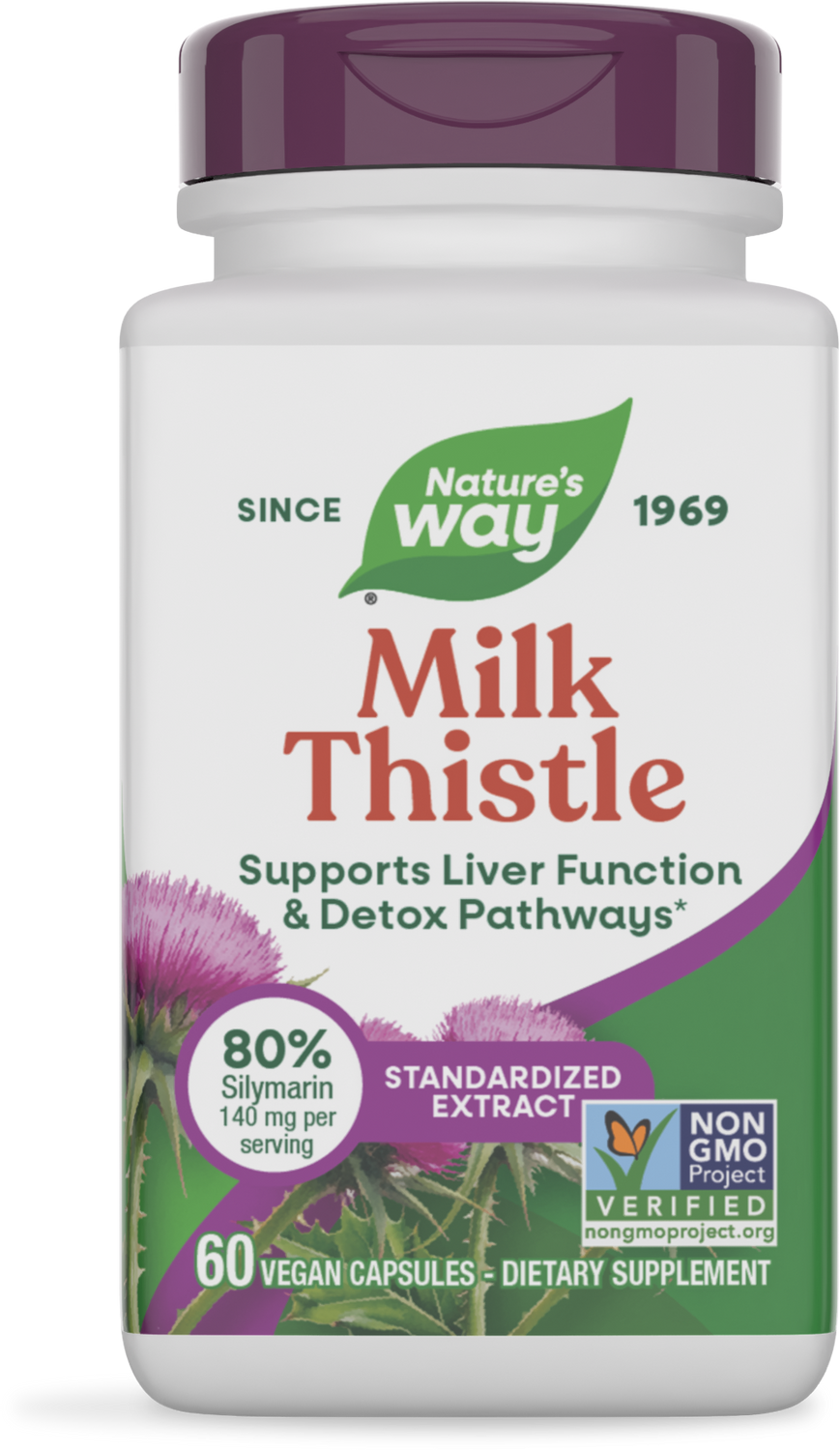 Nature's Way Milk Thistle is a dietary supplement that supports liver function. Your liver is an important organ as it filters blood, secretes bile, and neutralizes toxins. It can also enable your body to produce proteins and energy, store key vitamins and minerals, maintain hormone balance, and help facilitate digestion. Milk Thistle contains a substance called silymarin that has been shown to support liver function. The plant itself has been used for over 2,000 years. Nature's Way Milk Thistle is standardized to ensure consistent levels of silymarin.