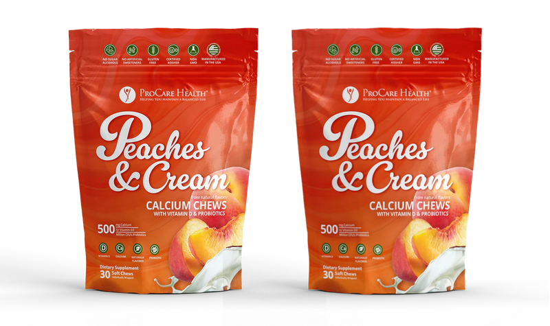 ProCare's Peaches & Cream Calcium Soft Chews contain TruCal® - a naturally sourced, lactose-free calcium. Each soft chew is individually wrapped for convenience, making it easy to take your calcium supplement anywhere. Fresh peach and cream flavors blend with natural sweeteners like tapioca syrup and raw cane sugar. No artificial sweeteners or sugar alcohols are used in our formula.