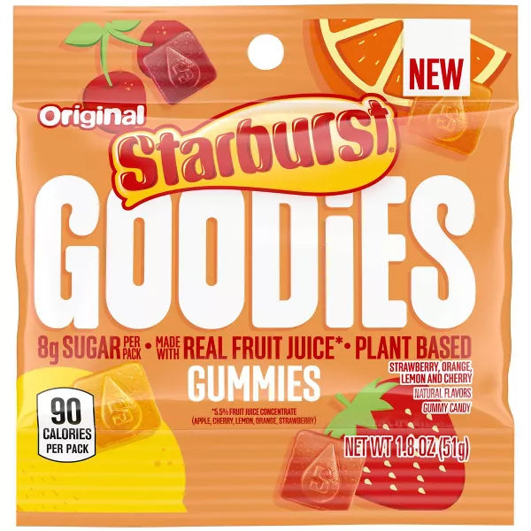 The unexplainably juiciness of STARBURST just got REAL! NEW STARBURST GOODIES Gummies have arrived. These STARBURST gummies are plant-based, low in sugar, no gluten, no GMOs, and no allergens, no wonder why they're called GOODIES. Made with real fruit juice, STARBURST GOODIES are the guilt-free sweet treat you've been waiting for!