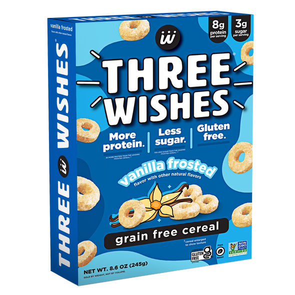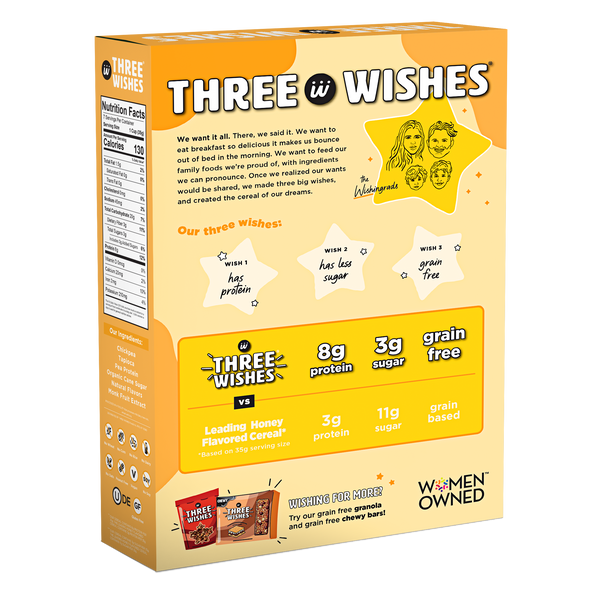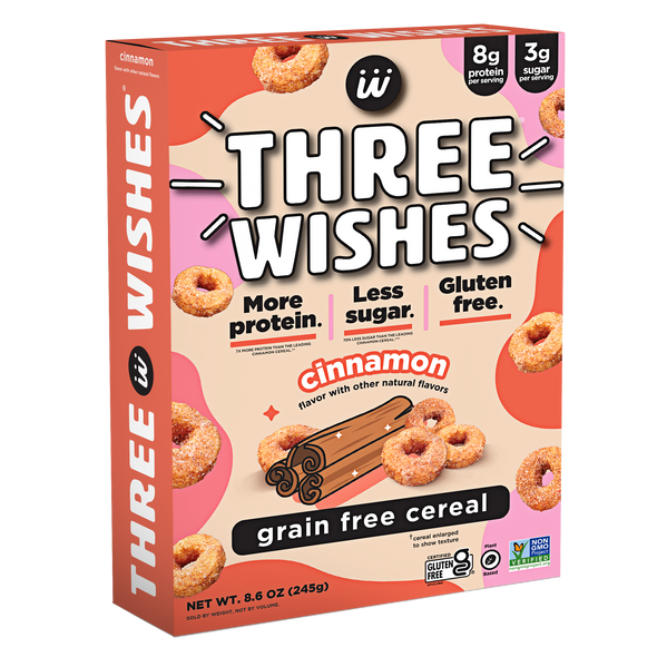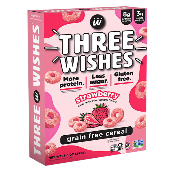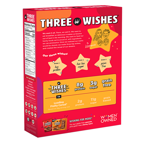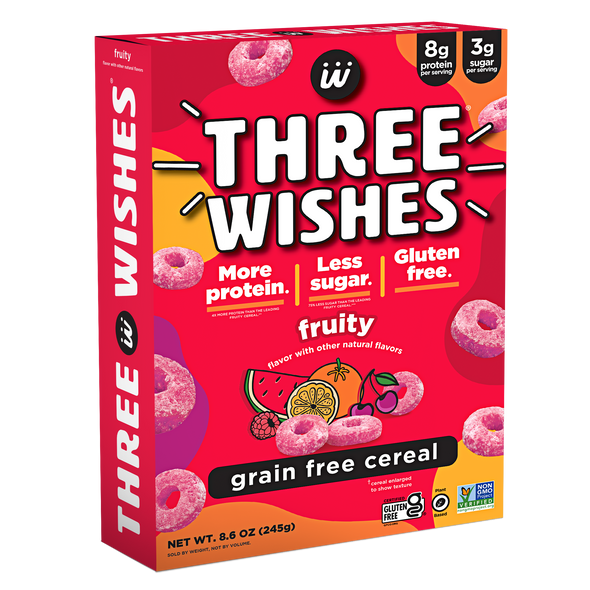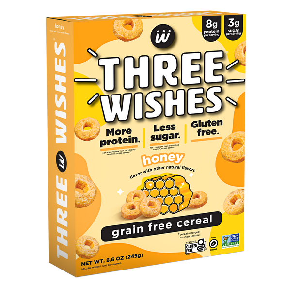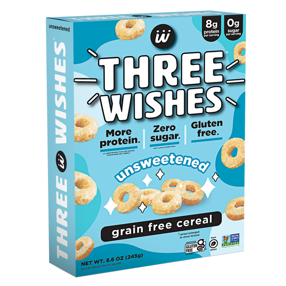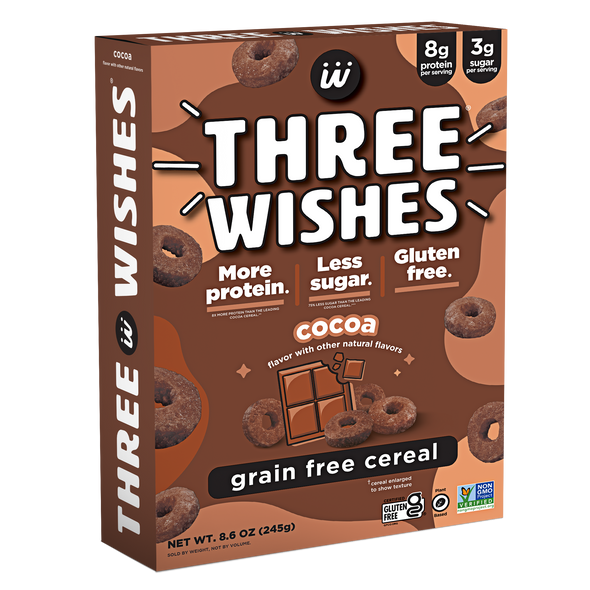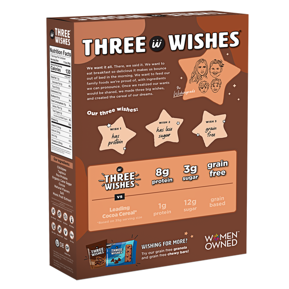 Three Wishes Grain Free Cereal is a low sugar, gluten free, plant-based cereal made from chickpeas and pea protein. With 70% less sugar and more protein than leading cereals, Three Wishes Grain Free Cereal is the one your whole family will love. Three Wishes Cereal contains no soy, no wheat, no dairy, no corn, no rice, no oats, and no peanuts.